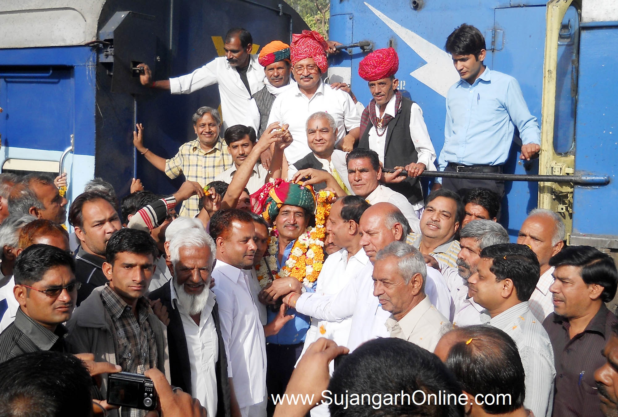 लम्बे इंतजार के बाद गत बजट में घोषित जम्मू तवी- बान्द्रा विवेक एक्सप्रेस गाड़ी का रविवार सुबह सुजानगढ़ पंहूचने पर कस्बेवासियों ने चालक दल का फूलमालाओं से स्वागत किया। पूर्व मंत्री खेमाराम मेघवाल, जिप सदस्य पूसाराम गोदारा, पवन चितलांगिया, बाबूलाल दुगड़, शैलेन्द्र लाटा, सुभाष बेदी, मदन सोनी, गणेश मण्डावरिया, यंग्स क्लब के सचिव गिरधर शर्मा, हरिप्रसाद तोदी, महावीर मिरणका, अयूब नसवाण, नानू खां, युसुफ गौरी, सांवरमल अग्रवाल सहित अनेक कस्बेवासियों ने चालक व गार्ड का माला पहनाकर व साफा बांधकर स्वागत किया।