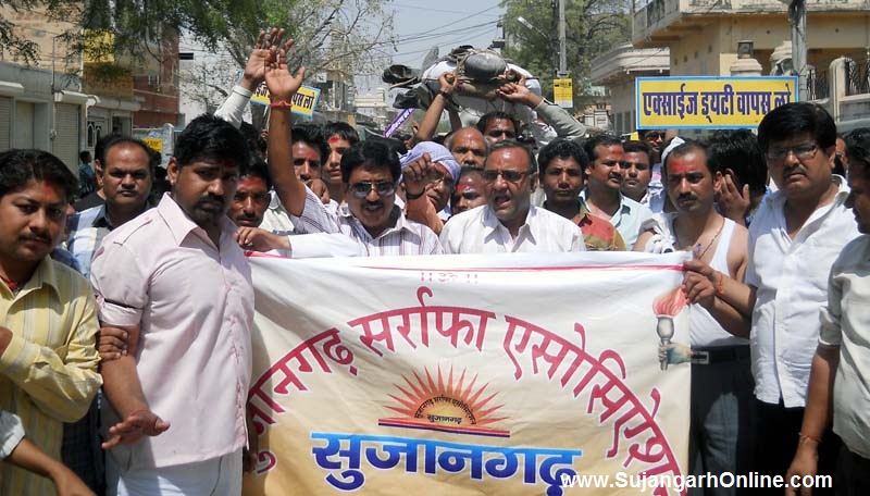 भारत सरकार द्वारा सोने के कारोबार पर कस्टम ड्युटी व एक्साईज ड्युटी लगाने के विरोध में कस्बे के सर्राफा एसोसिएशन द्वारा चलाये जा रहे आन्दोलन के तहत गांधी चौक में वित्तमंत्री प्रणव मुखर्जी का पुत्तला फुंका गया। रेलवे स्टेशन से वित्तमंत्री के पुत्तले की शव यात्रा निकाली गई, जो कस्बे के मुख्य मार्गो से होती हुई गॉंधी चौक पंहुची, जहां नारे बाजी के साथ वित्तमंत्री का पूतला फुंका गया। संयोजक शिवकुमार मौसूण ने बताया कि विरोध प्रदर्शन में लाडनूं, पडि़हारा, छापर, चाड़वास, बीदासर, साण्डवा, कानूता व सालासर सहित सुजानगढ़ तहसील के सैंकडो स्वर्णकारो ने हिस्सा लिया।