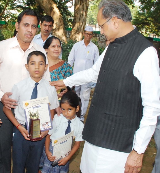 स्थानीय नया बास स्थित त्रिशला पब्लिक स्कूल की कथा 8 के छात्र पंकज शर्मा एवं कक्षा द्वितीय की छात्रा गुंजन गोदारा को मुख्यमंत्री अशोक गहलोत ने प्रशस्ति पत्र एवं प्रतीक चिन्ह प्रदान कर सम्मानित किया। जयपुर स्थित मुख्यमंत्री निवास में आयोजित संक्षिप्त कार्यक्रम में मुख्यमंत्री अशोक गहलोत ने पंकज शर्मा को विद्यालय के बेस्ट बॉय एवं गुंजन गोदारा को बेस्ट गर्ल के अवार्ड से सम्मानित किया। मुख्यमंत्री ने संस्था निदेशक आनन्दसिंह शेखावत द्वारा शिक्षा के क्षेत्र में किये जा रहे प्रयासों की सराहना करते हुए उन्हे प्रयास जारी रखने के निर्देश दिये। इस अवसर पर निदेशक आनन्दसिंह शेखावत ने बताया कि मुख्यमंत्री द्वारा दिये गये दिशा-निर्देशों से उनमें नये जोश का संचार हुआ है एवं संस्था को विकास की नई गति मिली है। शेखावत ने बताया कि मुख्यमंत्री ने शिक्षा के अतिरिक्त अन्य क्षेत्रों में उल्लेखनीय प्रदर्शन करने पर भी सम्मानित किया।