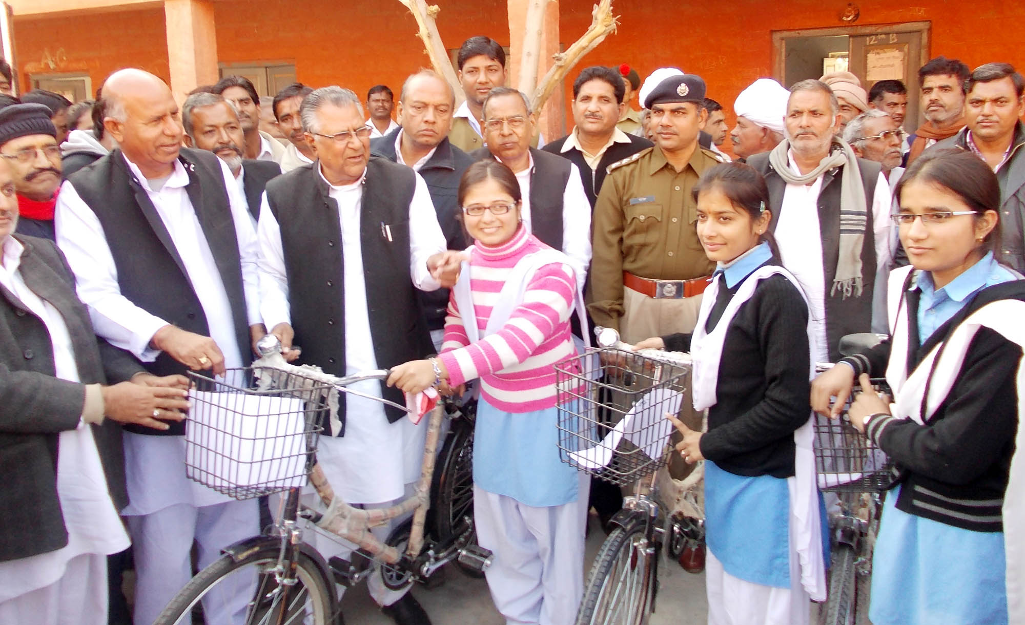 बालिका शिक्षा को प्रोत्साहन देने के उद्देश्य से राज्य सरकार द्वारा बालिकाओं को दी जा रही साइकिलों के वितरण का कार्यक्रम पूर्व शिक्षा एवं श्रम व रोजगार मंत्री एवं स्थानीय विधायक मा. भंवरलाल मेघवाल के मुख्य आतिथ्य में कस्बे के राजकीय पूनमचन्द बगडिय़ा उच्च माध्यमिक विद्यालय में आयोजित किया गया। संस्था प्रधान अशोक कुमार शर्मा की अध्यक्षता में आयोजित कार्यक्रम के विशिष्ट अतिथि पूर्व प्रधान व जिप सदस्य पूसाराम गोदारा एवं शहर ब्लॉक कांग्रेस अध्यक्ष प्रदीप तोदी थे। कार्यक्रम का आगाज मां सरस्वती की प्रतिमा के समक्ष दीप प्रज्जवलित कर अतिथियों द्वारा किया गया। कार्यक्रम में उपस्थित विद्यार्थियों एवं जनप्रतिनिधियों तथा संस्था प्रधानों को सम्बोधित करते हुए पूर्व शिक्षा मंत्री मा. भंवरलाल मेघवाल ने कहा कि उनके शिक्षा मंत्री रहने के दौरान यह सुनिश्चित किया गया कि 6 से 14 साल तक का एक भी शिक्षा से वंचित नहीं रह पाये। उन्होने कहा कि प्रदेश में बालिका शिक्षा को बढ़ावा देने के उद्देश्य से दो किमी से अधिक की दूरी तय कर स्कूल पंहूचने वाली बालिकाओं को साईकिल सरकार द्वारा दी जा रही है।
