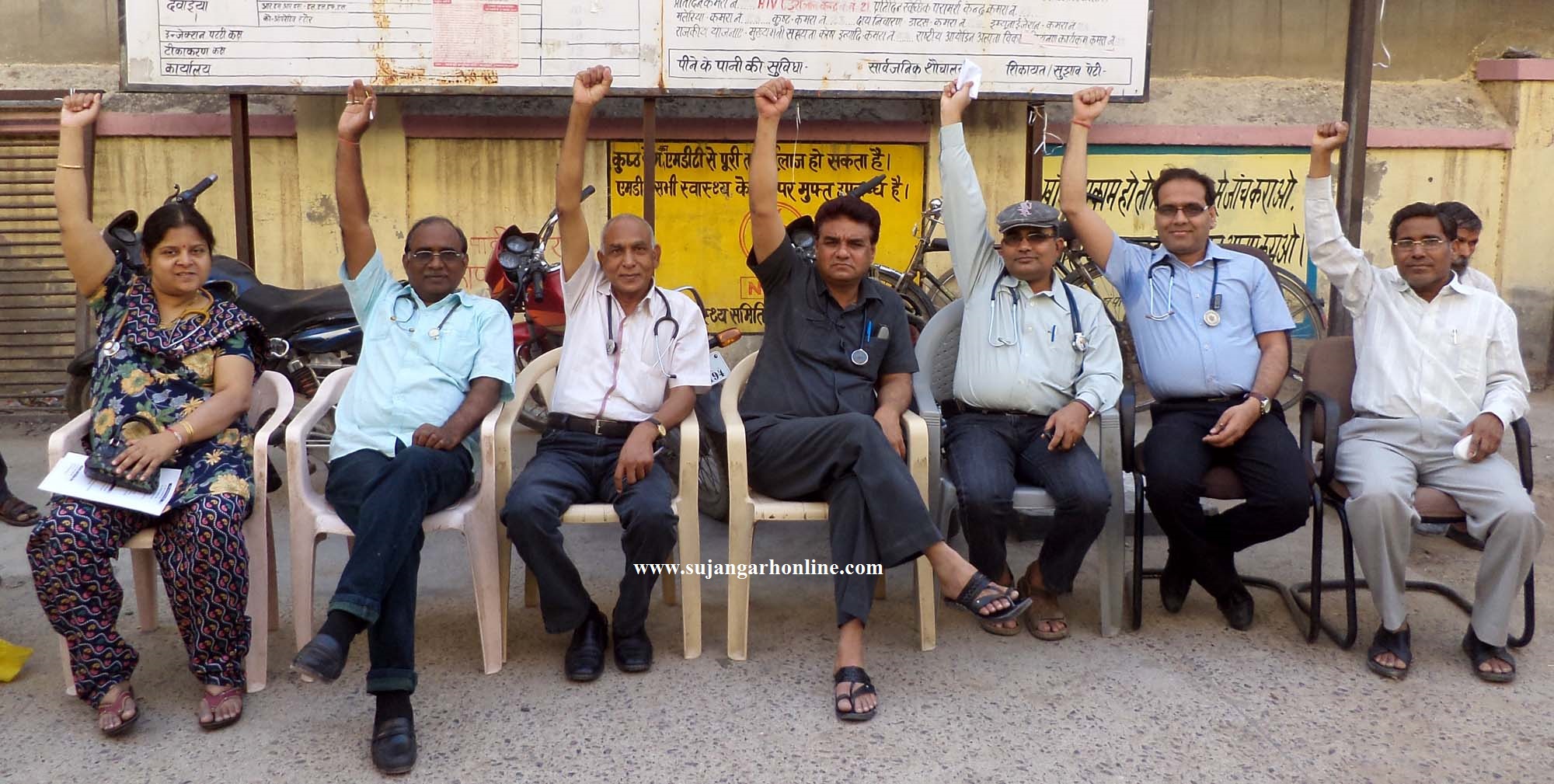 डा. जे.के. सकरवाल, डा. सीताराम गोदारा, डा. राजेन्द्र टण्डन, डा. डी.आर. जाटोलिया, डा. मैनपालसिंह, डा. मोतीलाल सोनी व डा. रेखा गुप्ता ने दो घंटे का कार्य बहिष्कार किया, वहीं पीएमओ डा. सी.आर. सेठिया, डा. मधु जैन व डा. दिलीप सोनी छुट्टी पर थे।