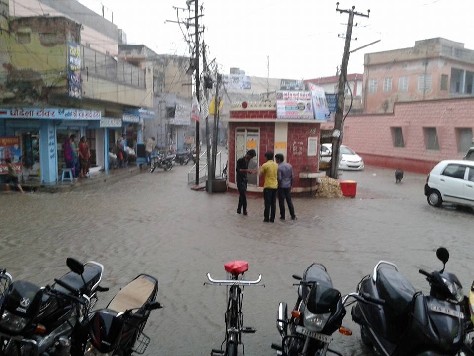 शुकवार शाम को अचानक मौसम का मिजाज बदला ओर अचानक आधा घण्टे मूसला धार बारिस होने मोसम खुशनुमा हो गया । आधाघ्ण्टे तक लगाातार वर्ष होने से शहर के गांधीचोक ,घटाधर ,स्टेशन रोड पर पानी भर गया । बसरात से करीबन एक घण्टे बिजली गुल रही । दुसरी तरफ बरसात होने से किसानो के चहेरे पर रोनक लोटी किसान को चिन्ता सता रही कि कब होगी जून माह पुरा बितने जा रहा है ओर बरसात नही होने से बाजरा की फसल की बुआई नही कि जा रही ।